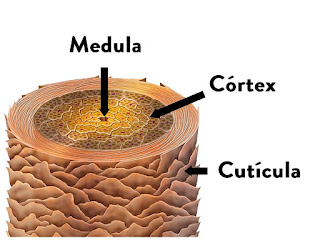 O cabelo é constituído por um interior de células queratinizadas dispostas em faixas, que por sua vez são revestidas por várias camadas de queratina, formando a cutícula.
